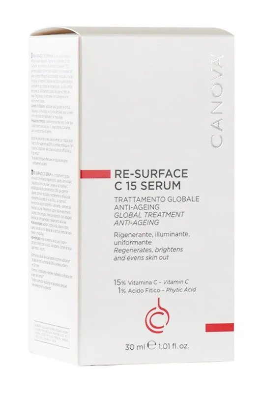 Re-Surface 15 serium è un trattamento globale innovativo con efficacia rigenerante, illuminante e uniformante dell’incarnato. E’ a base di vitamina C stabilizzata ad alta concentrazione (15%), che consente di ottenere un’elevata performance, mantenendo nel tempo l’efficacia dell’ingrediente. La Vitamina C, in associazione all’Acido Fitico, favorisce un’azione schiarente e illuminante, contrastando le macchie brune. Previene i segni dell’invecchiamento cutaneo, quali rughe, segni di espressione, colorito spento e non omogeneo, rilassamento cutaneo.