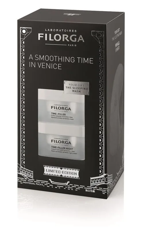 TIME FILLER NIGHT: Trattamento anti-rughe notte. L’efficacia di Time-Filler con una azione NOTTURNA RINFORZATA [Rughe da cuscino + gonfiori mattutini]: il complesso levigante EXPRESS-RECOVER associa un booster di elastina a un detossinante cutaneo per avere i tratti distesi e un incarnato più fresco e luminoso sin dal risveglio.Texture gel-crema fondente. Rughe da contrazione: Un esapeptide per distendere i tratti senza alterarne l’espressività. Rughe profonde: Un potente booster di collagene combinato all’acido ialuronico incapsulato per rimpolpare visibilmente le rughe marcate. Rughe superficiali: Il gluconolattone esfoliante associato a un principio attivo effetto peeling per levigare le linee sottili. Rughe da disidratazione: Un estratto vegetale in grado di trattenere l’acqua per ridurre in modo duraturo le rughe da mancanza di idratazione. Tutta l’esperienza filorga in medicina estetica concentrata in una crema per ridurre visibilmente tutti i tipi di rughe notte dopo notte.