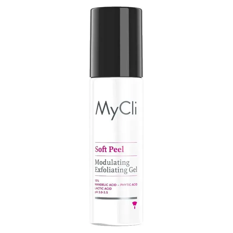 MyCli Soft Peel contiene un pool di acidi – mandelico, lattico e fitico – al 15% a pH tamponato, su un veicolo adatto a tutti i tipi di pelle.